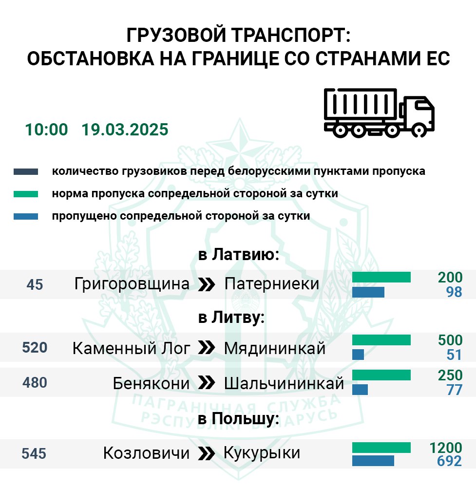 Самый загруженный маршрут в Евросоюз проходит через польский пункт пропуска Кукурыки (Козловичи). Перед данным погранпереходом въезда на сопредельную территорию ожидают 545 большегрузов, его контрольные службы за сутки пропустили 58% транспорта от нормы, т.е. 692 из 1200 фур.