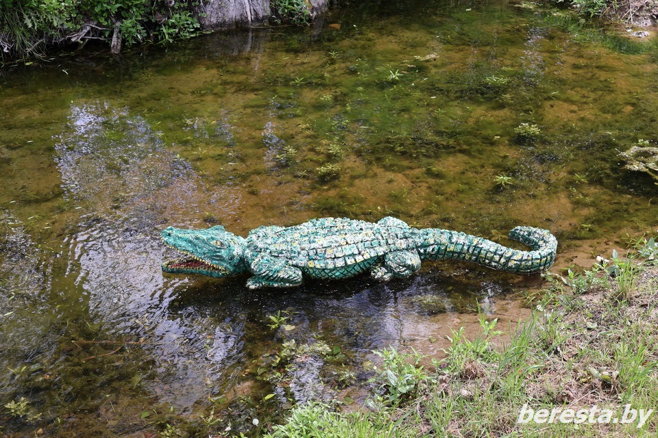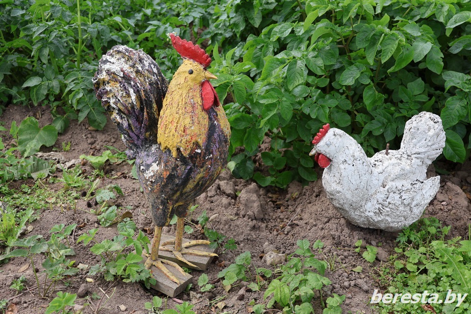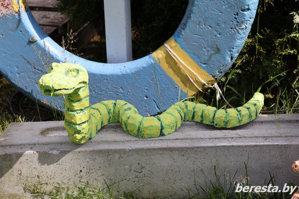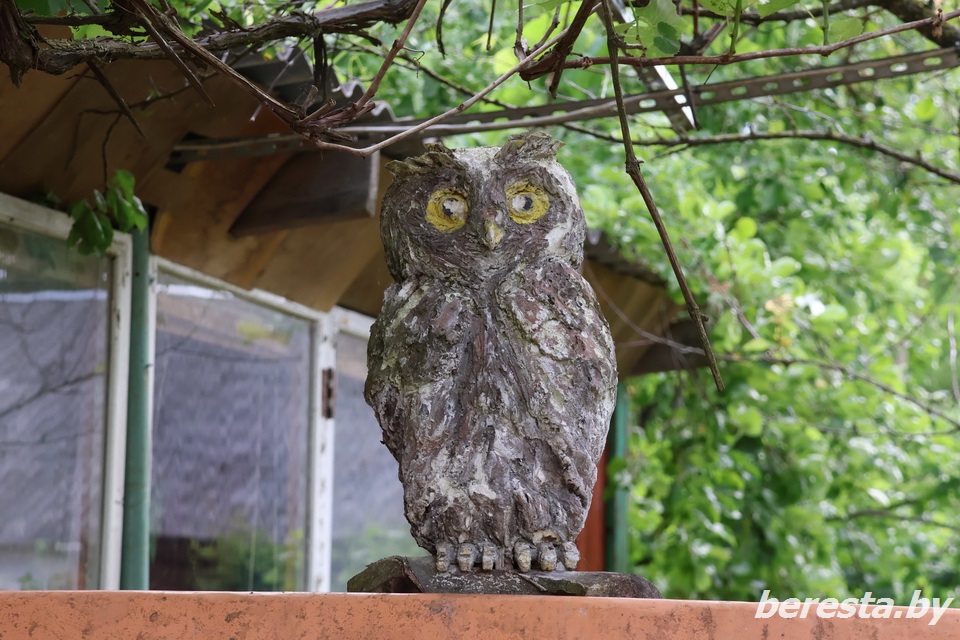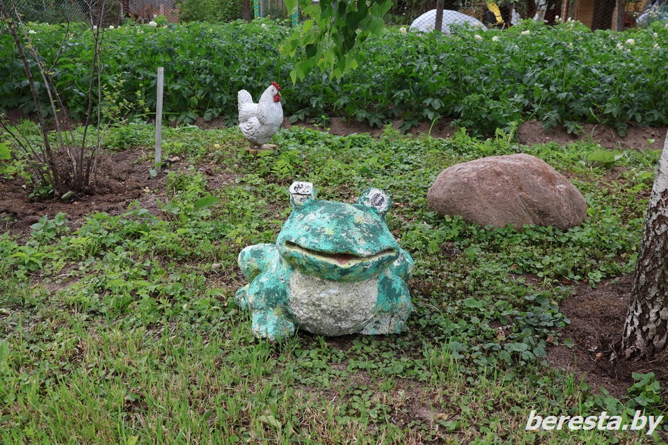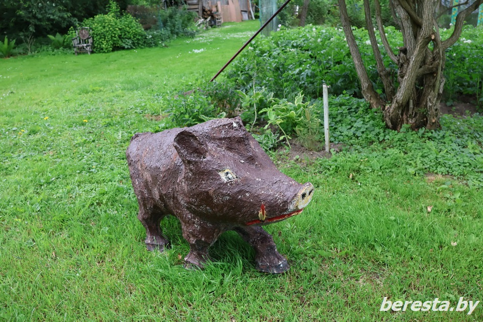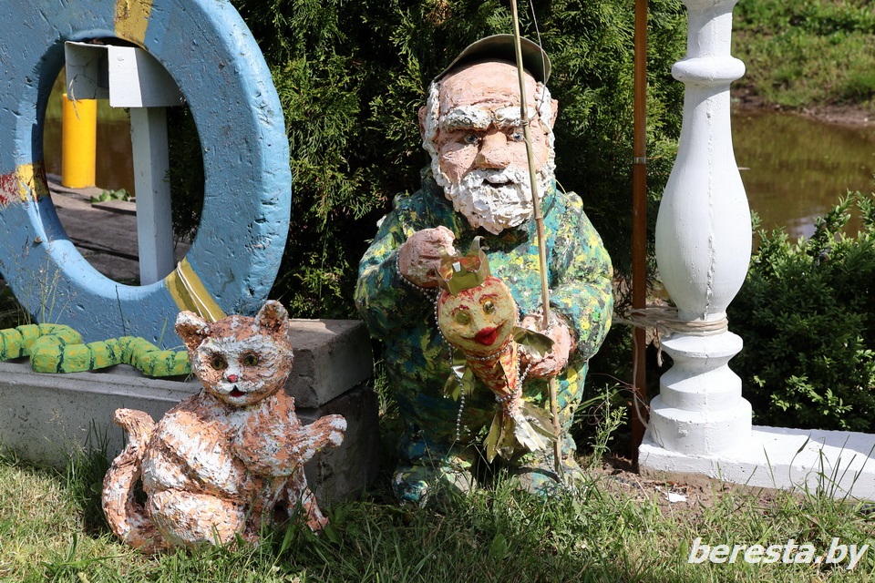 Как-то будучи в отпуске, Сергей Евгеньевич приехал в Каменку один, ему было скучно, и он решил сделать аистов из пенопласта. Когда приехали жена с сыном, очень удивились, увидев, что по участку «ходят» аисты, ведь они были как настоящие! После этого появилось много дачных жителей, и у каждого свое особое место. Мудрая сова восседает на крыше колодца. Мышь с лопатой агитирует к работе на огороде: «Заходи, не ленись, поработать торопись»! Мирно ходят курочки вместе с петухом. У озера ждет змея, которая из-под новогодней елки переселилась сюда и живет по соседству с рыбаком, а он, как в сказке, поймал золотую рыбку. Олень смирно лежит на пастбище, наблюдая за тем, что происходит вокруг. А вот дикий кабанчик куда-то спешит. И крокодил, откуда ни возьмись, плывет по реке – это и вовсе из области фантастики. Он, как живой, медленно дрейфует по местным водам.