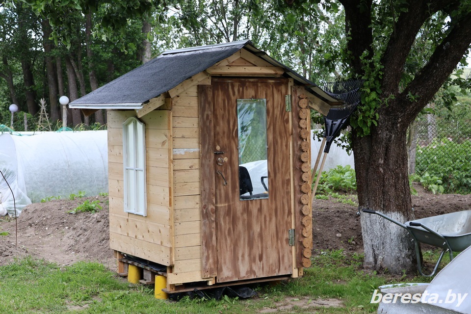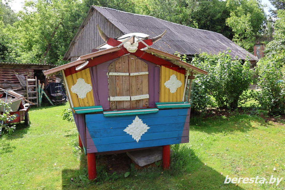 Есть и сказочный теремок со ставнями. Свой отдельный домик есть даже у сельскохозяйственного инвентаря. А вот маленькая беседка не только удобная, но и функциональная: колеса делают ее мобильной – можно перевезти в любое место на дачном участке.