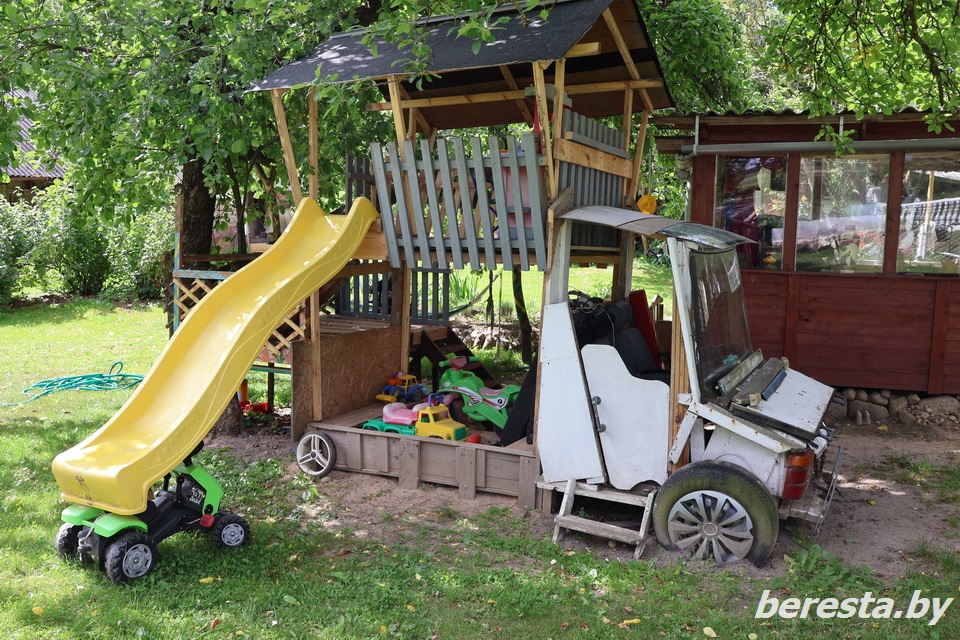 Природа, свежий воздух, речка – все это, конечно хорошо. Но внукам на участке должно быть еще и весело. Поэтому для них дедушка смастерил игровую зону. Для мальчишек – автомобиль с песочницей, а для внучки собственную кухню, где она готовит свои песочные кулинарные шедевры.