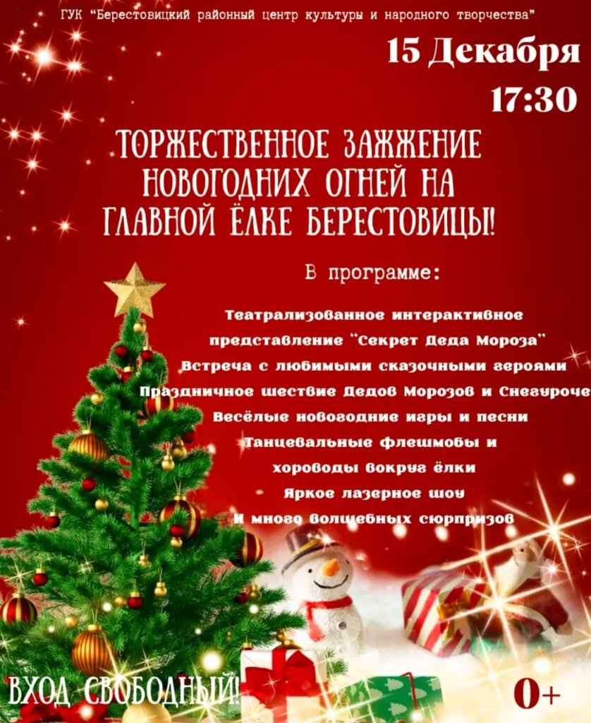 Берестовицкий районный центр культуры и народного творчества приглашает всех мальчишек и девчонок, мам и пап, бабушек и дедушек 15 декабря на самое волшебное событие уходящего года — торжественное зажжение праздничных огней на главной Новогодней елке Берестовицы!