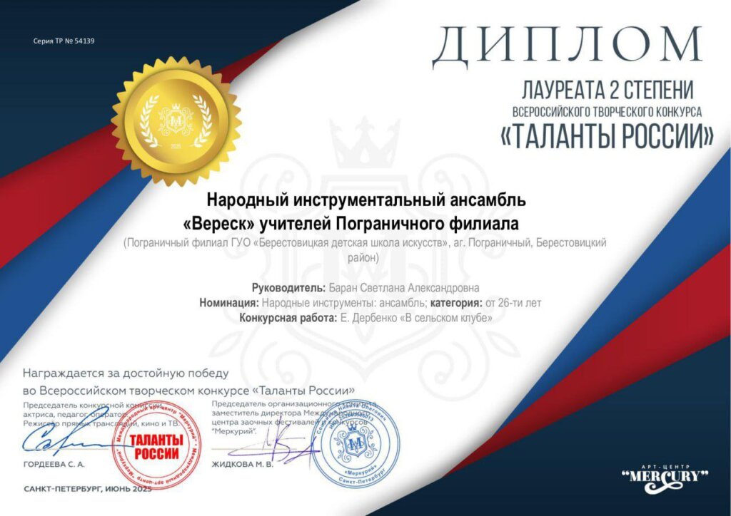 Народный инструментальный ансамбль «Вереск» учителей Пограничного филиала стал лауреатом II степени на конкурсе «Таланты России».