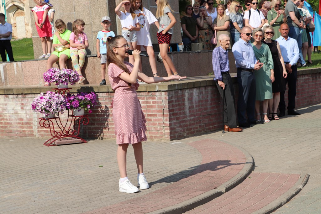 После исполнения государственного гимна Республики Беларусь представители выпускных классов возложили цветы к памятнику воину-освободителю, чтобы в Год исторической памяти выразить признание всем тем, кто отважно защищал нашу страну и приближал Великую Победу.