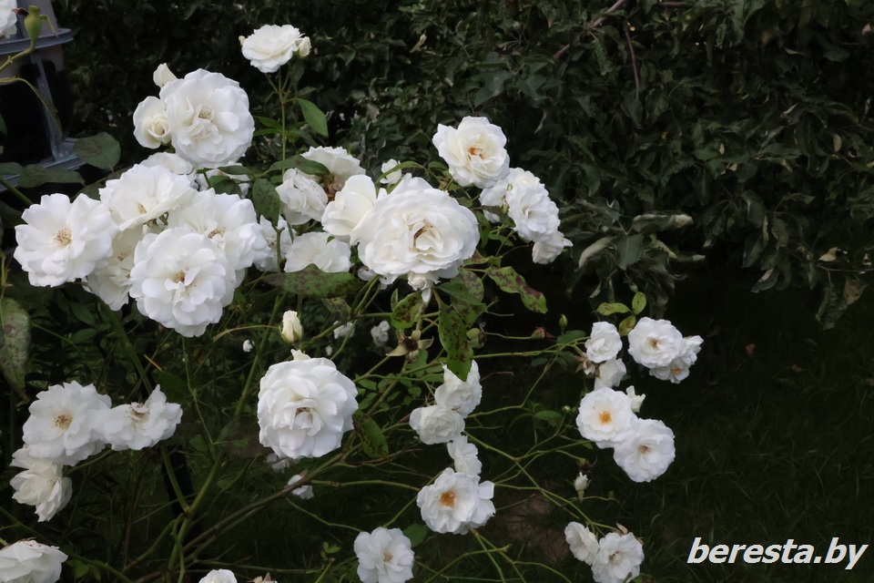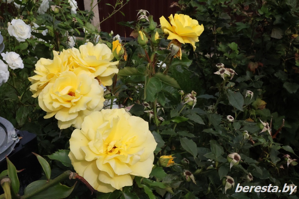 Перед входом в дом нас встречают жернова от мельницы и красивые многолетние кустарники. Смотрятся они очень органично, особенно в тандеме со свежескошенным газоном. Дальше, недалеко от входа, растут белые, красные и желтые розы, композицию завершают нежно-розовые и белые гортензии. Ольга Позняк очень любит розы, они высажены по всему придомовому участку. Эти цветы отлично гармонируют с утонченностью и женской красотой хозяйки.