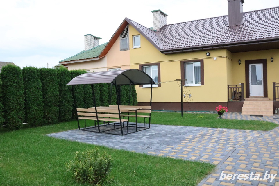 Ближе к дому расположена площадка для отдыха – уютная беседка, вокруг полно места для игр, бассейна и батута. Семья часто проводит вечера на свежем воздухе.