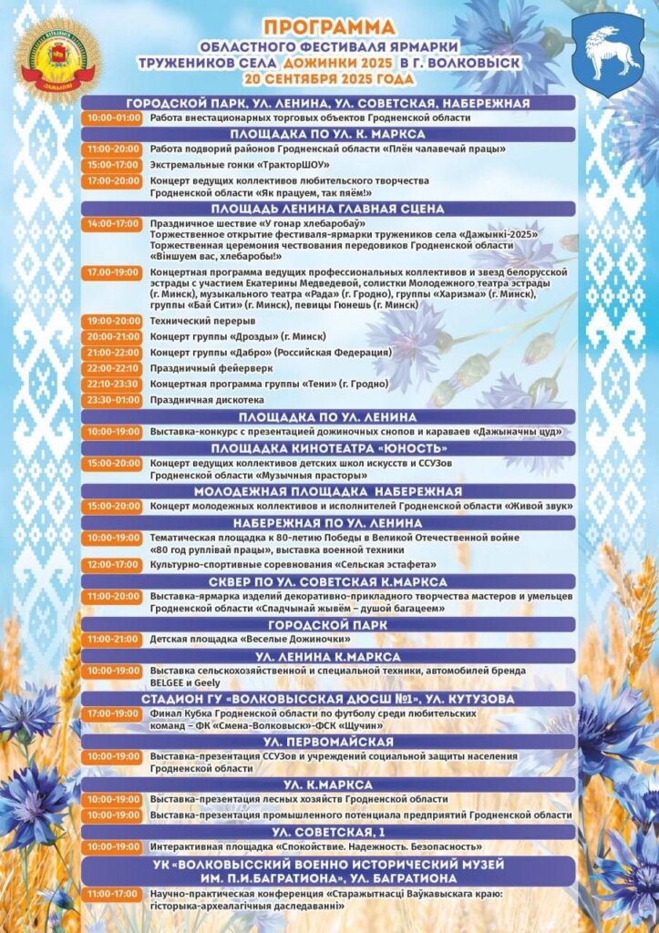На пл.Ленина и главной сцене в 14:00 начнется праздничное шествие «У гонар хлебаробаў», торжественное открытие фестиваля «Дажынкі-2025» и церемония чествования передовиков Гродненской области. В 17:00 стартует концертная программа ведущих профессиональных коллективов и звезд белорусской эстрады с участием Екатерины Медведевой, солистки Молодежного театра эстрады (Минск), музыкального театра «Рада» (Гродно), группы «Харизма» (Минск), группы «Бай Сити» (Минск), певицы Гюнешь (Минск).