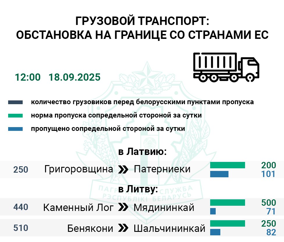 Очередь грузового транспорта перед литовскими пунктами пропуска также увеличилась — с 850 до 950 фур. Сопредельная сторона за 24 часа приняла на свою территорию всего 15% грузовиков от нормы.