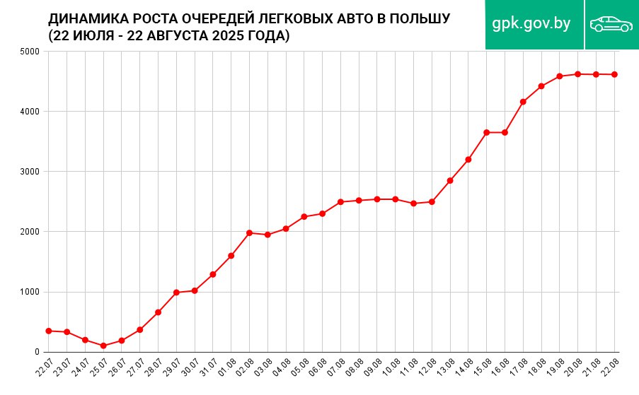 Очередь легкового транспорта перед польским пунктом пропуска Тересполь (Брест) с 22 июля выросла с 350 до 4630 единиц. Несмотря на огромное количество легкового транспорта, в течение всего месяца сопредельная сторона оформляла в среднем 34% авто от нормы.