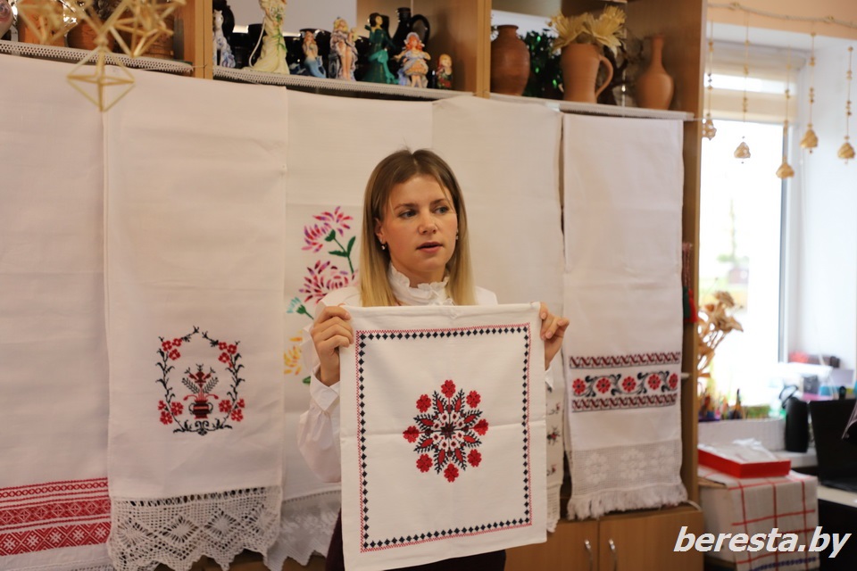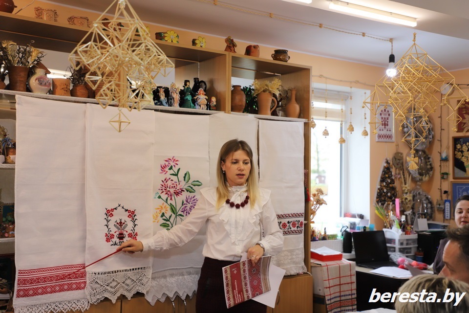 Мастер народных художественных ремесел Анастасия Касьян рассказала участникам семинара об истории белорусской вышивки. На примере рушника участники семинара узнали об особенностях вышивки крестиком, цветовой гамме и использовании этого атрибута в быту белорусов. Рассказала Анастасия Сергеевна и о технике вышивки «набор». Она показала присутствующим свои изделия, вышитые крестиком. Поделилась секретами вышивки, рассказала, какие материалы лучше использовать для выполнения качественных работ.