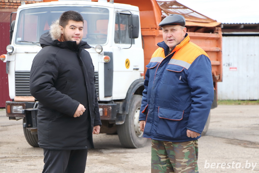 Начальник ДРСУ №160 Алексей Якута и водитель автомобиля Владимир Кузюкевич обсуждают предстоящий выезд на дорогу МАЗа с пескосолераспределителем. Владимир Николаевич – специалист со стажем, передовик, не единожды заносился на Доску почета и награждался грамотами различного уровня. Но главное – он один из тех, на кого можно положиться даже в самых эстренных обстоятельствах. На какой бы технике Владимир Кузюкевич ни работал, всегда показывает отличный результат.