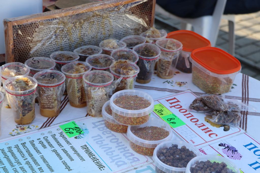 Традиционно на ярмарке можно было приобрести мед и продукцию пчеловодства. Покупателей привлекала колоритная палатка пчеловода из Волковысского района Александра Товкача, часть ульев которого расположена и у нас, в Старом Дворце.
