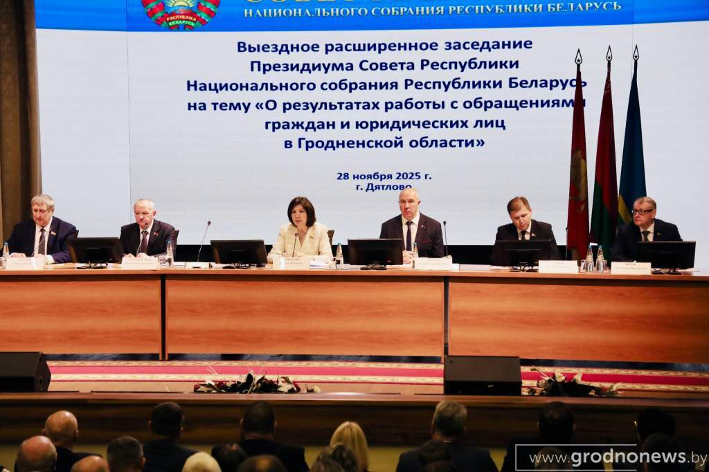 Выездное расширенное заседание Президиума Совета Республики Национального собрания Республики Беларусь проходит под руководством главы верхней палаты Парламента Натальи Кочановой. Участие в заседании также принимают председатель Гродненского облисполкома Юрий Караев, помощник Президента – инспектор по Гродненской области Константин Бурак.