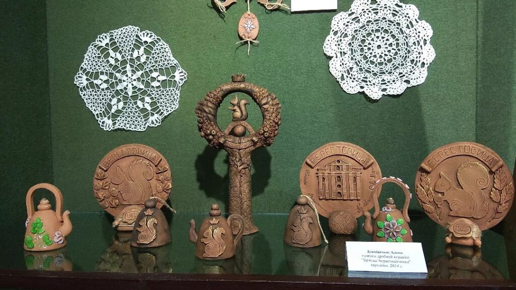 Глиняные изделия на выставке представлены Еленой Денищик. С техникой изготовления из глины, глиняных изделий мастер познакомилась в годы учебы в Гродненском педагогическом колледже. Основноые художественные изделия Елены — керамические статуэтки, панно, свистульки, колокольчики и другие изделия. Так же мастер занимается вытинанкой и декоративно-прикладным творчеством.