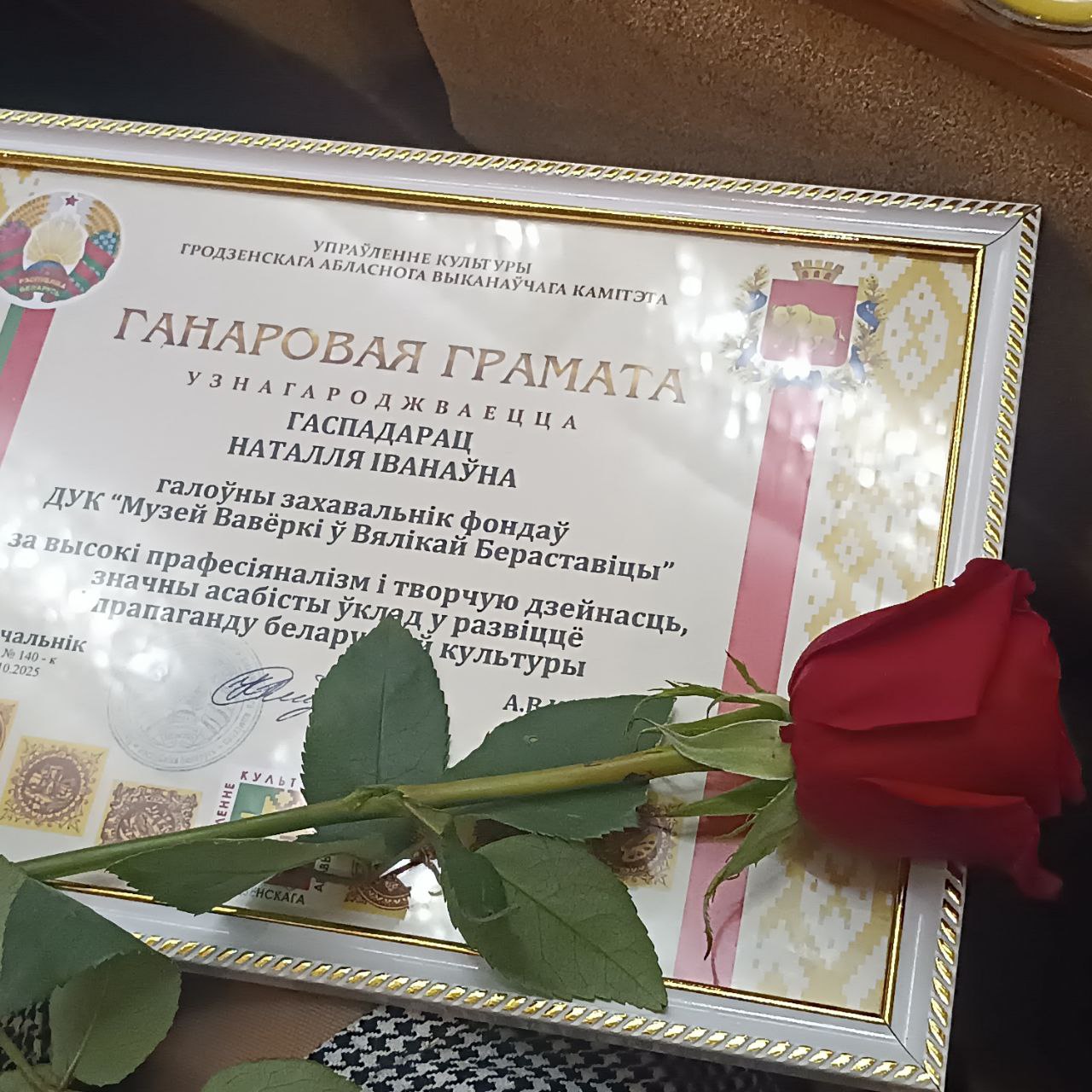 Заслуженной наградой — Почетной грамотой Управления культуры Гродненского областного исполнительного комитета отмечена главный хранитель фондов ГУК «Музей Белки в Большой Берестовице» — Наталья Ивановна Господарец.