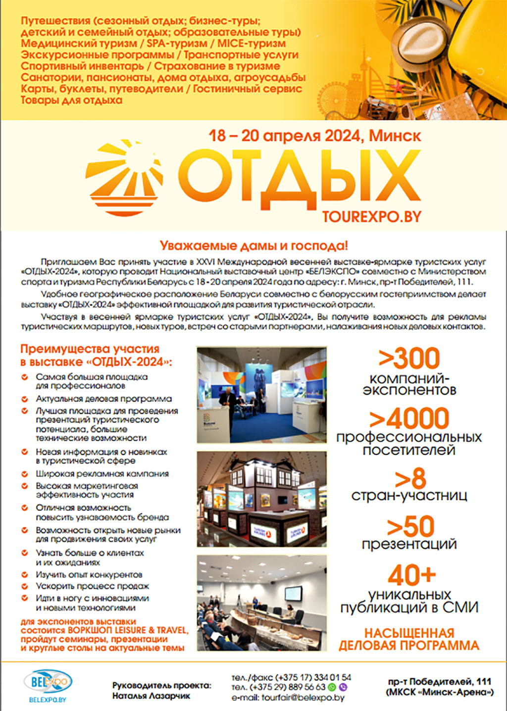 С 18 по 20 апреля 2024 г. на базе ГУ «Многопрофильный культурно-спортивный комплекс «Минск-арена», состоится 26-я международная весенняя выставка-ярмарка туристских услуг «ОТДЫХ – 2024», которая является одним из наиболее значимых событий туристической индустрии Республики Беларусь.