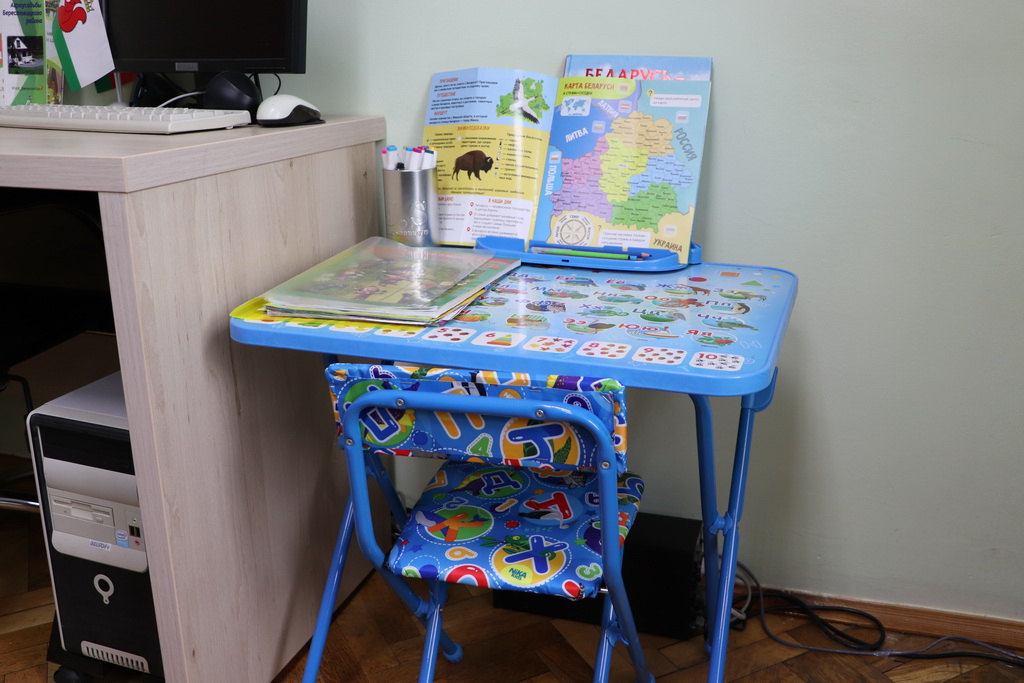 Для удобства в службе «одно окно» предусмотрен детский уголок в месте ожидания приема. Он содержит занимательный материал для детей разного возраста: детские журналы, раскраски, фломастеры и карандаши. Для старших детей интересны будут карта Беларуси и книги нравственно- патриотического характера.
