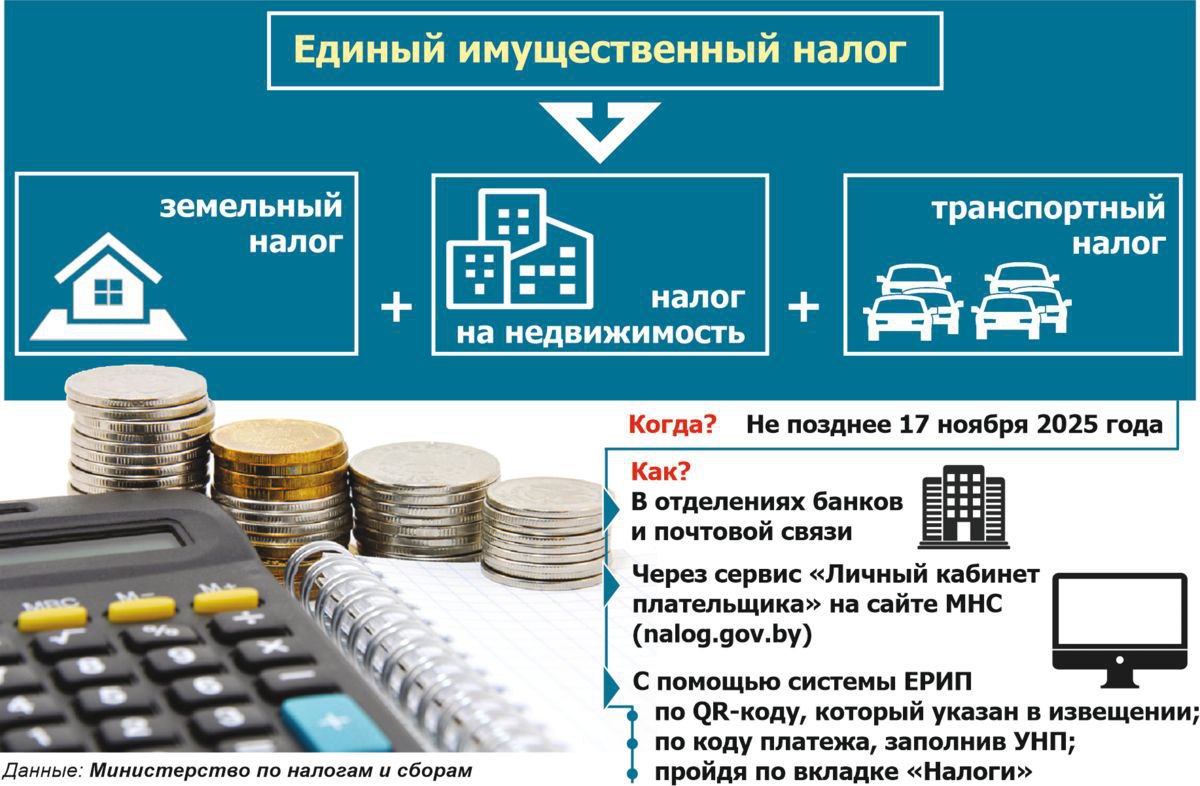Оплату единого имущественного налога можно произвести любым удобным способом через систему «Расчет» (ЕРИП). Для этого достаточно знать свой УНП (учетный номер плательщика), который указан в извещении. Оплатить можно в интернет-банкинге, мобильном приложении вашего банка, инфокиоске, а также в отделениях банка или почтовой связи. Законодательство не требует вносить всю сумму единовременно. Платеж можно разбить на несколько частей, главное — полностью погасить задолженность до установленного срока — 17 ноября.