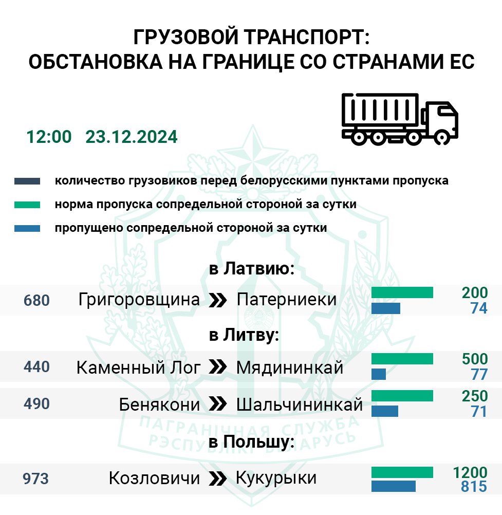 Самый загруженный маршрут проходит через польский Кукурыки (Козловичи). Перед данным пунктом пропуска въезда на сопредельную территорию ожидают 973 большегрузов, его контрольные службы за два дня оформили 64% фур от нормы.