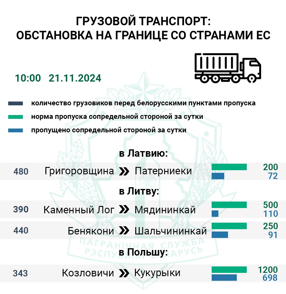 Свыше 1600 большегрузов ожидают въезда в ЕС. Самый загруженный маршрут проходит через латвийский пункт пропуска Патерниеки (Григоровщина). За сутки его контрольные службы оформили лишь 36% большегрузов, т.е. в среднем сопредельная сторона принимала 3 фуры из 8 положенных в час.