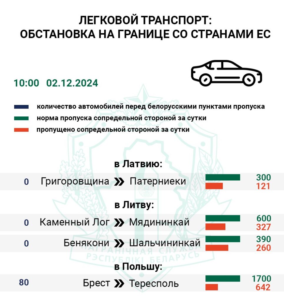Наиболее загруженным при следовании в ЕС для легкового транспорта оставался польский пункт пропуска Тересполь (Брест). Среднесуточная очередь на въезд в Польшу с 1 по 30 ноября составляла 450 легковушек. Контрольные службы Польши приняли в общей сложности 45% авто от нормы.