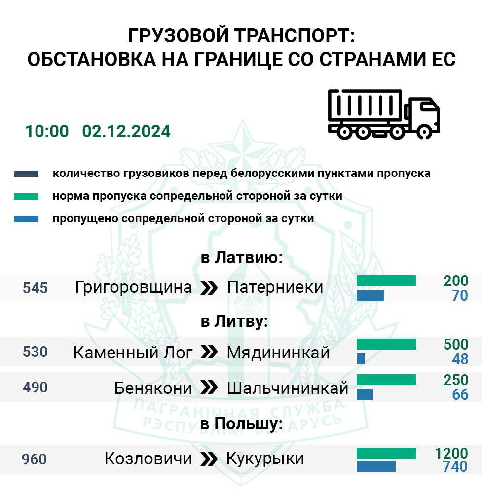 В течение ноября самый загруженный маршрут в ЕС проходил через латвийский пункт пропуска Патерниеки (Григоровщина). Среднесуточная очередь составляла 419 большегрузов. Контрольные службы Латвии в среднем приняли на свою территорию 34% фур от нормы.